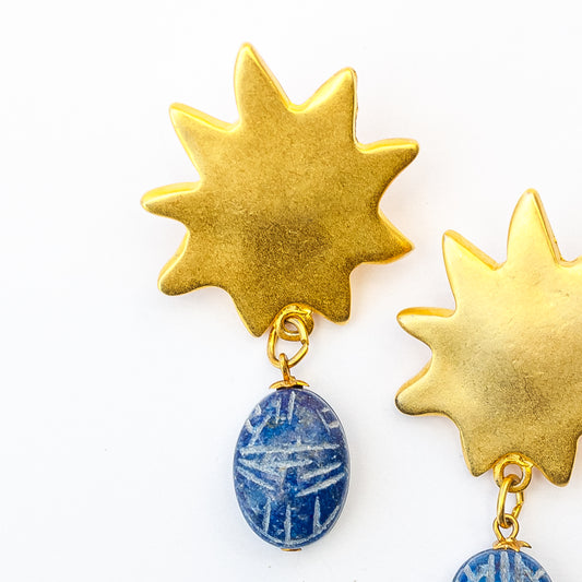 1980's Saks Fifth Avenue Gold Plated Lapis Scarab Stone Earrings