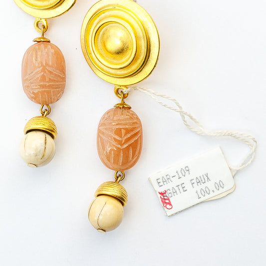 1980's Saks Fifth Avenue Gold Plated Agate Scarab Bead Earrings