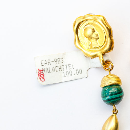 1980's Saks Fifth Avenue Gold Plated Malachite Earrings