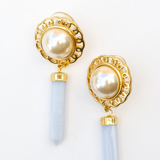 1980's Saks Fifth Avenue Gold Plated Quartz and Faux Pearl Earrings