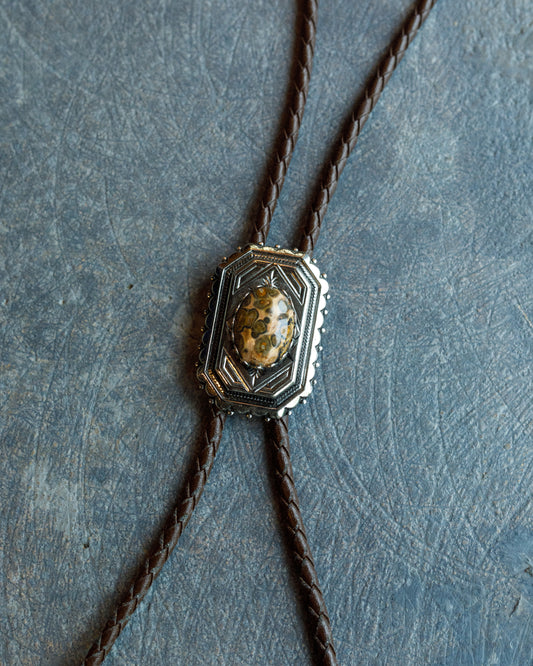 Vintage Leather Bolo Tie with Polished Stone in Silver-Tone Setting