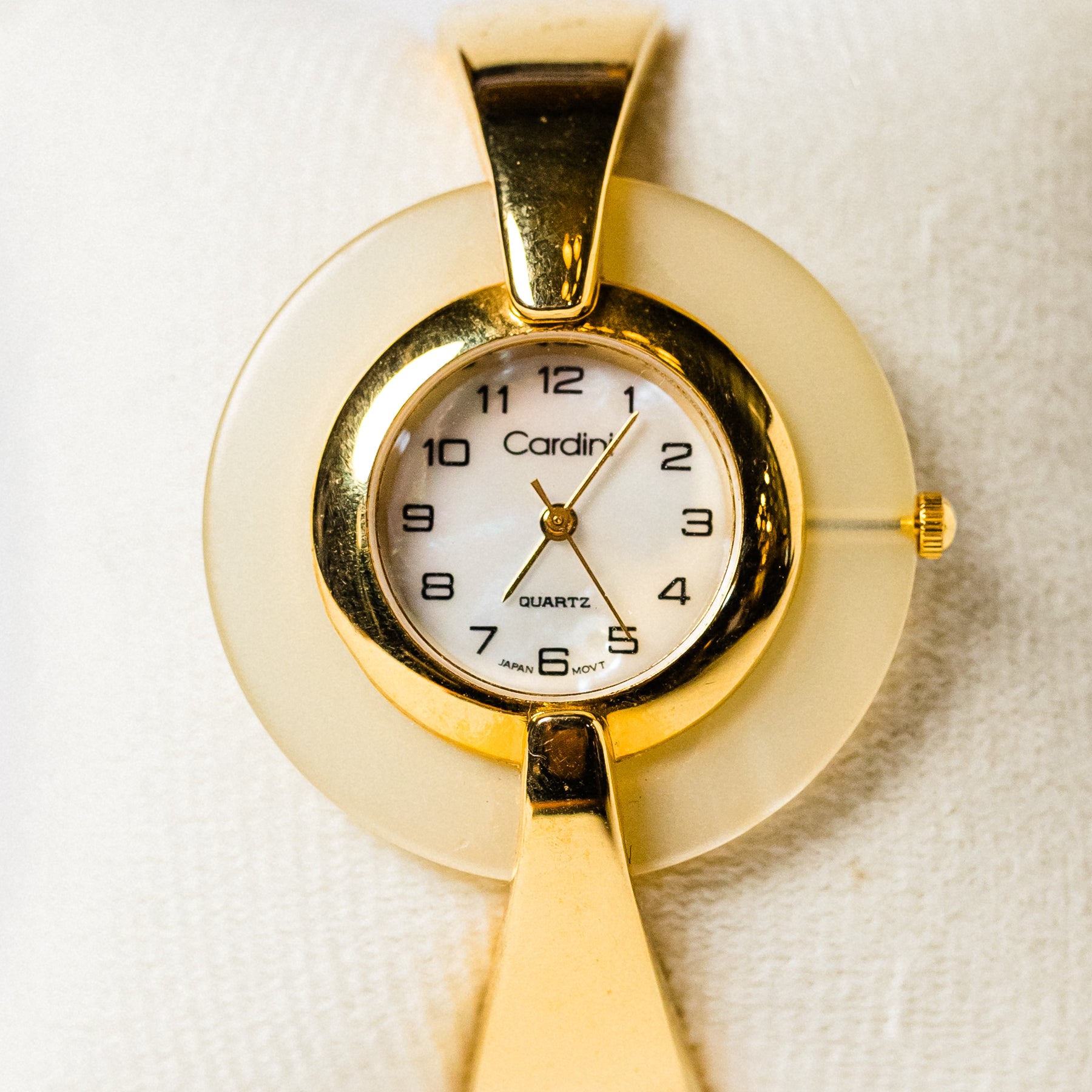 Polished gold-tone bangle watch by Cardini with acrylic frame around pearlescent clock face.