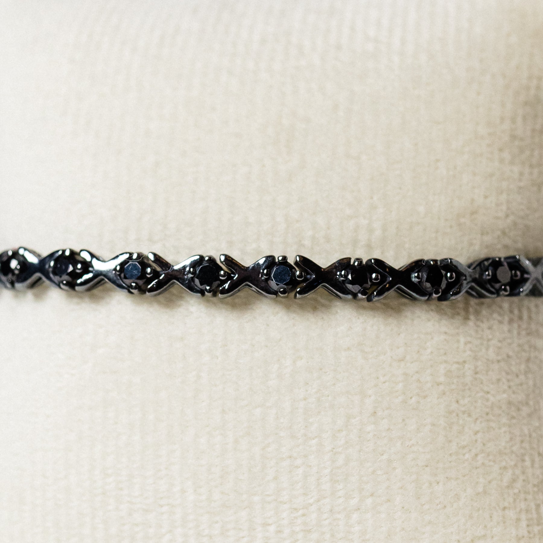 Black tennis bracelet featuring X motif and black stones throughout and open box clasp.