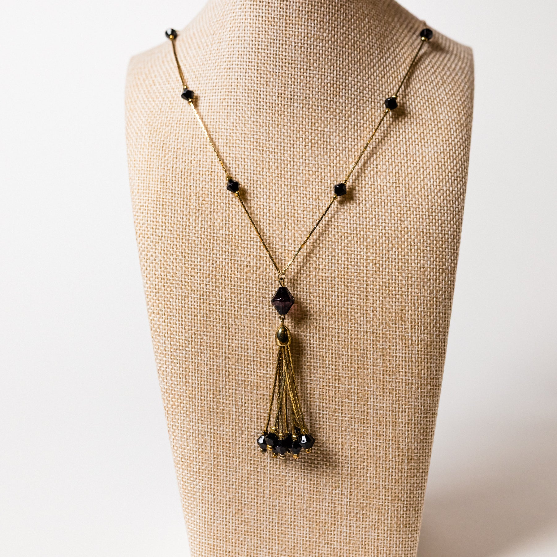 Beautiful, long gold-tone necklace featuring purple acrylic beads throughout design and chain and bead tassel at the end.