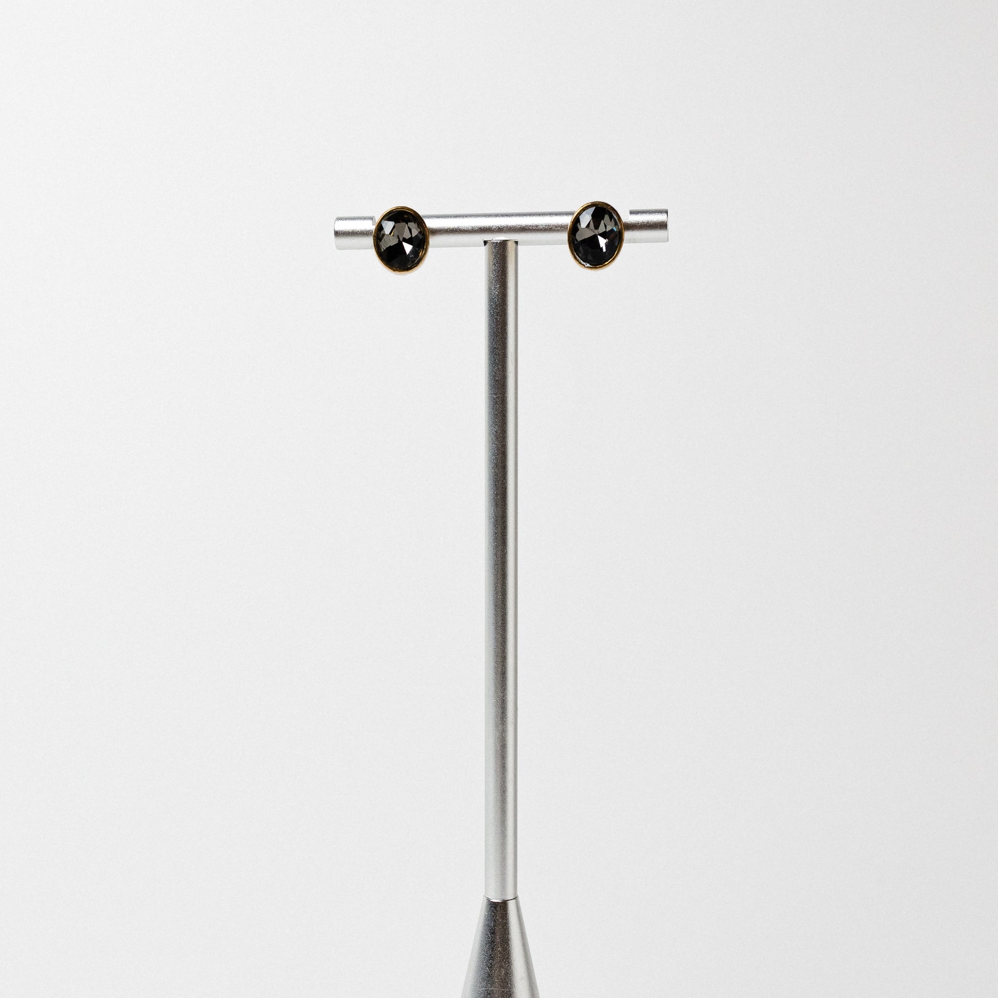 Beautiful gold-tone flush bezel stud earrings featuring smoky-colored crystal center stone.