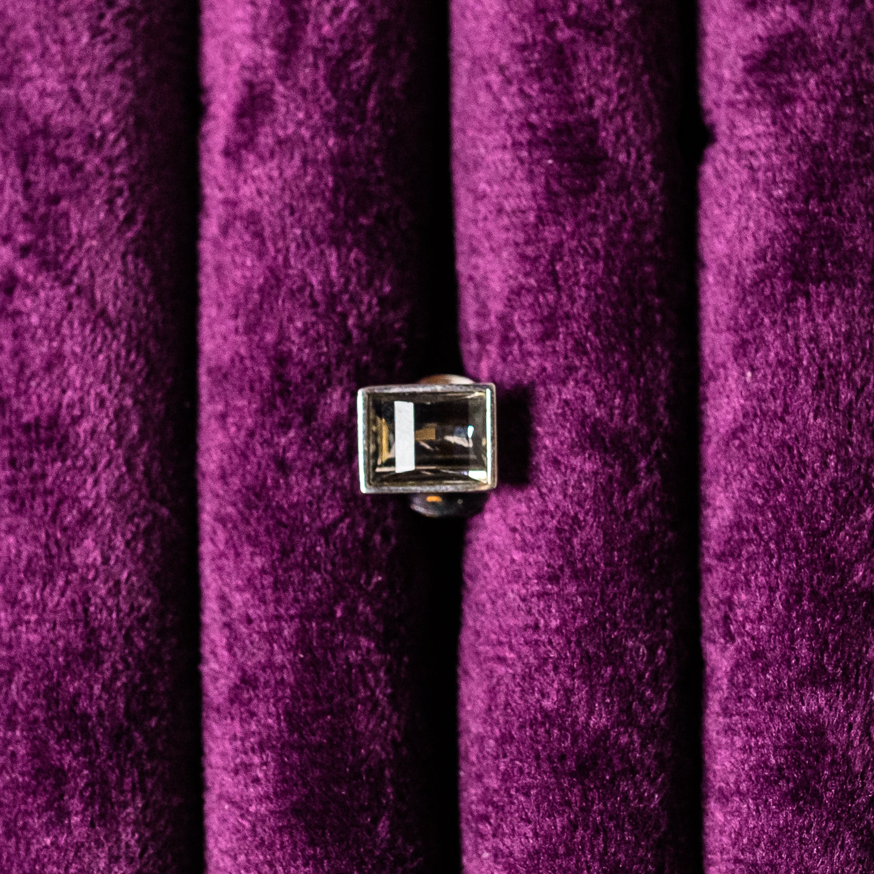 Beautiful tie tack featuring smoky faceted crystal in a flush bezel setting
